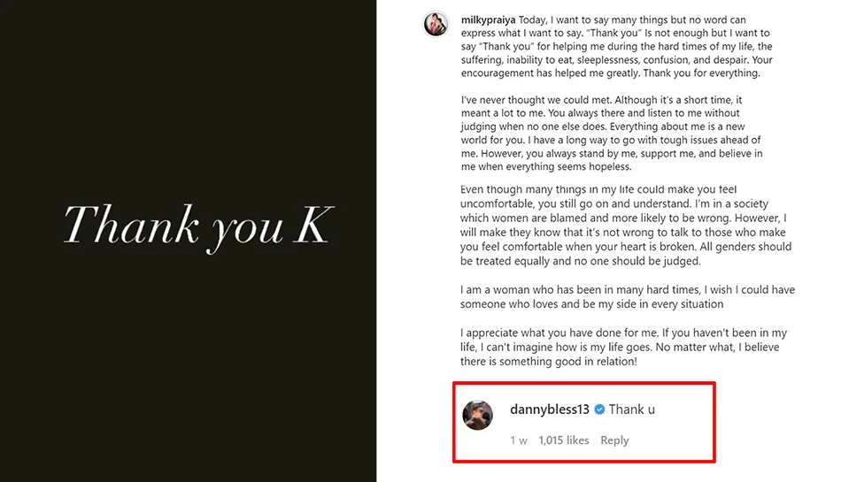 ด า ม ใจ เนื่องจากเธอได้ โ พ ส ต์ ถึง K เพื่อเป็นการ ข อ บ คุ ณ ที่เข้ามาในชีวิตของเธอ